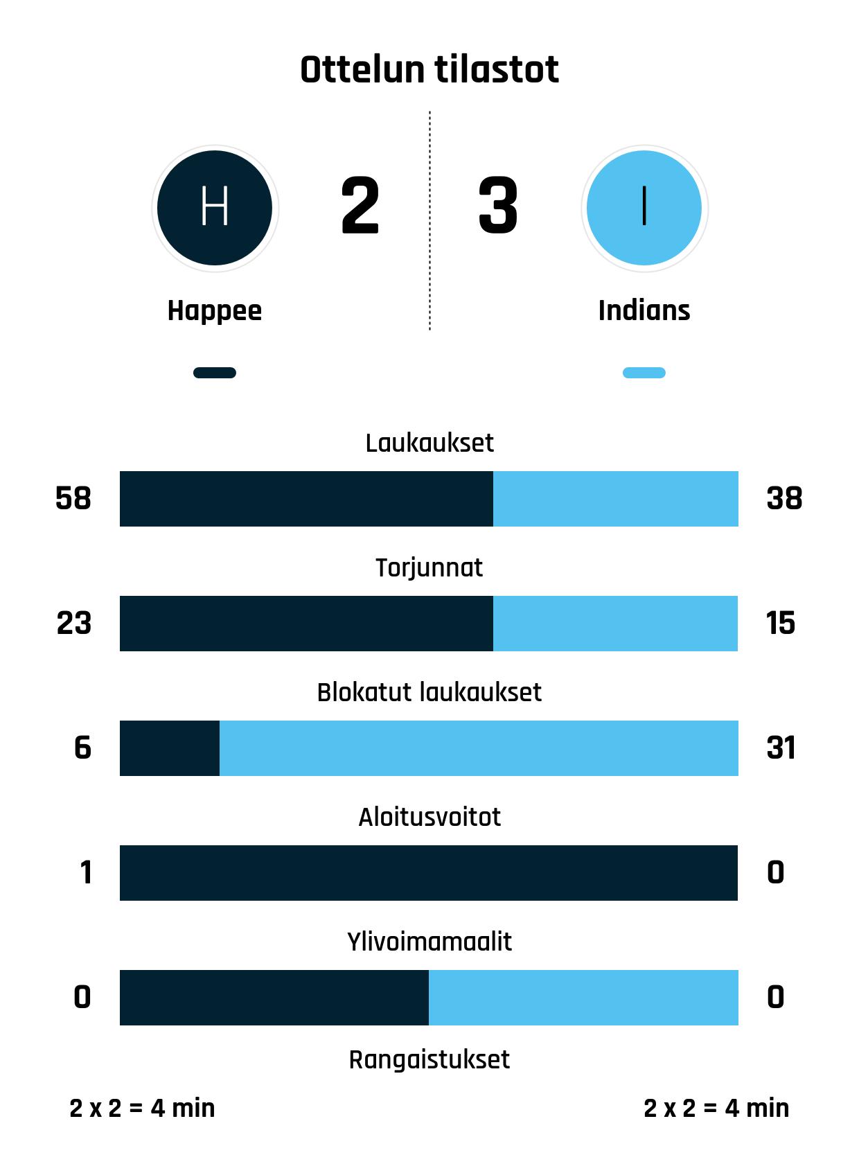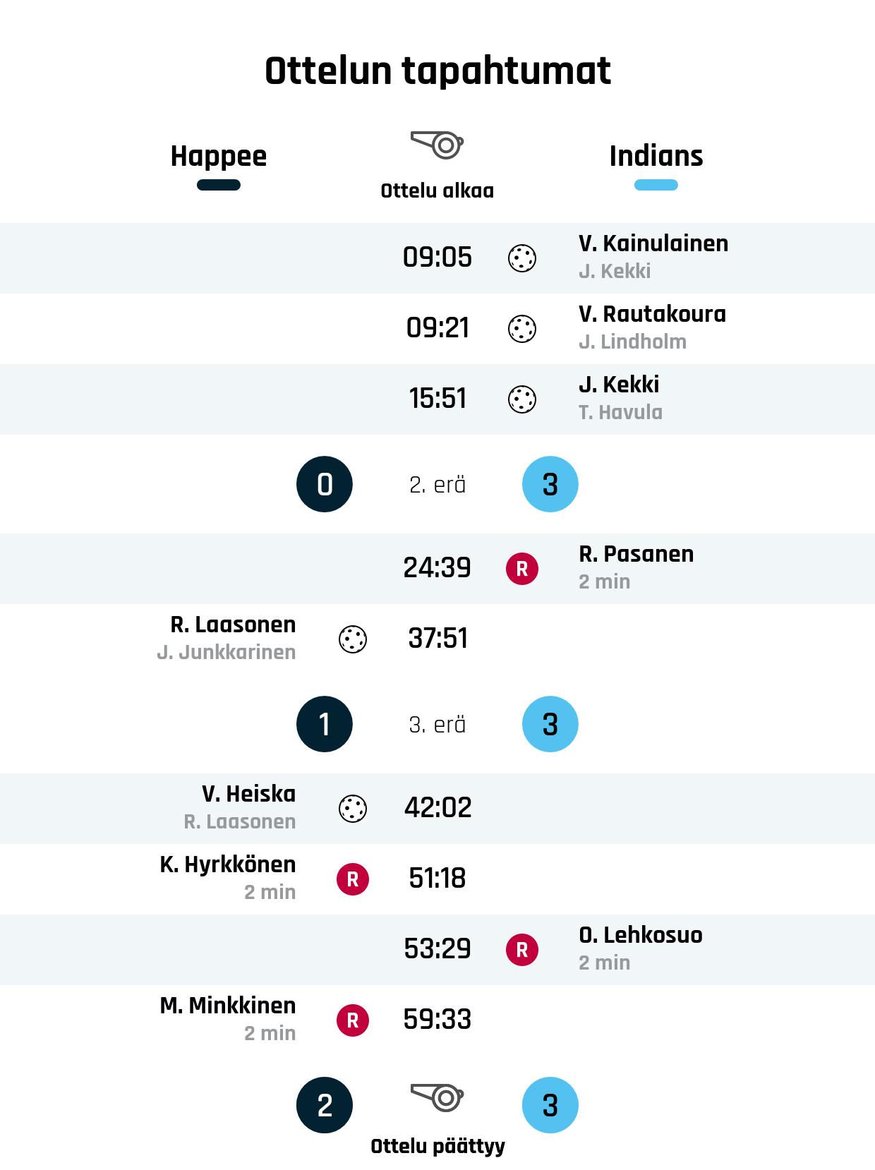 Indians vei voiton Happeesta tuloksella 2-3 (0-3, 1-0, 1-0). Indians pystyi pitämään johtoasemansa loppuun asti ja vei täydet pisteet. Ratkaisun iski kahden tehopisteen iltaa viettänyt Juuso Kekki. Pisteitä kertyi 1+1.