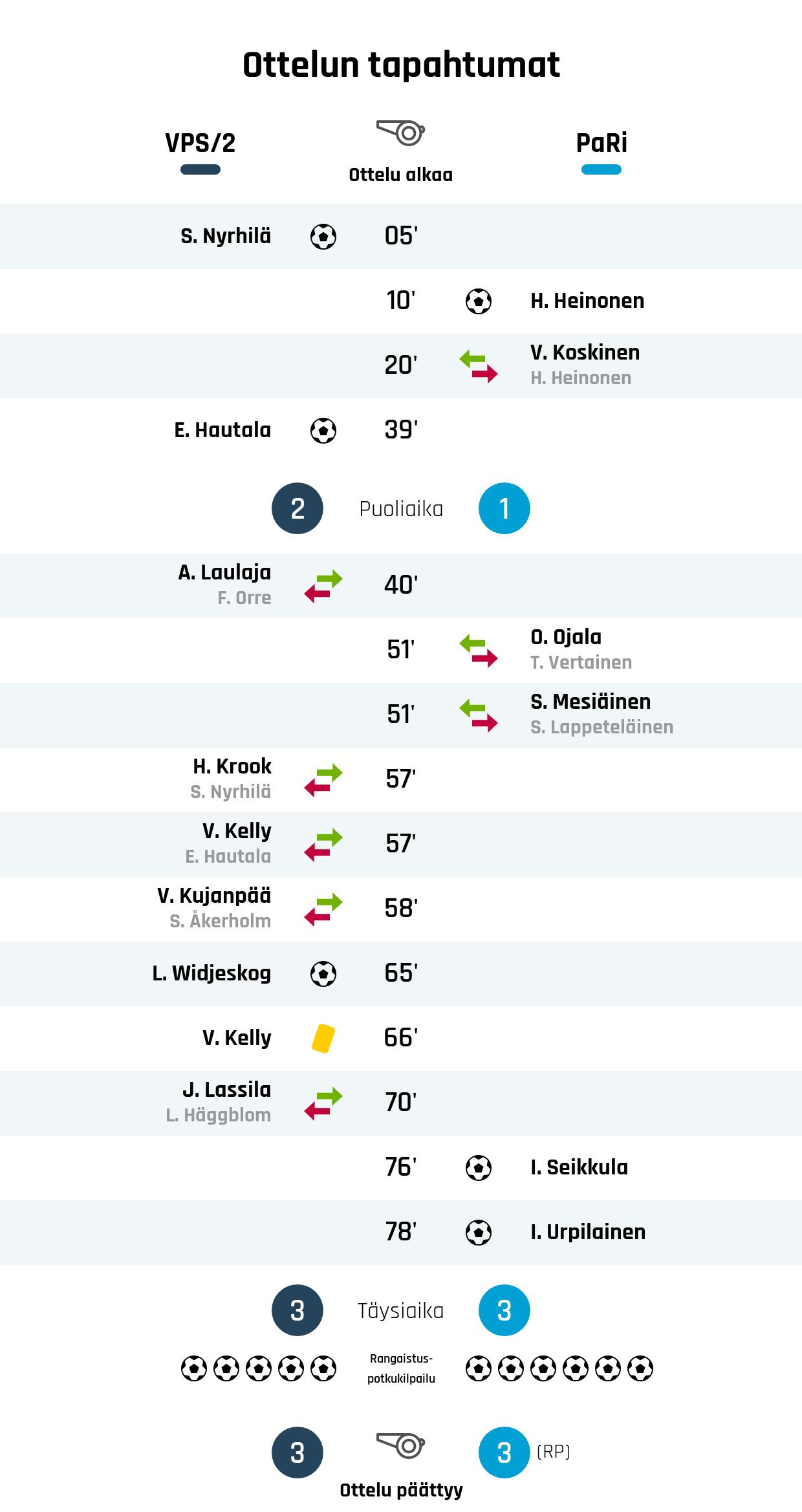 PaRi sai taisteltua itselleen voiton, kun VPS/2 taipui rangaistuspotkuilla. Ottelu päättyi varsinaisella peliajalla lukemiin 3-3. Varsinaisen peliajan jälkeen edettiin rangaistuspotkuihin, jotka PaRi voitti lukemin 6-5.