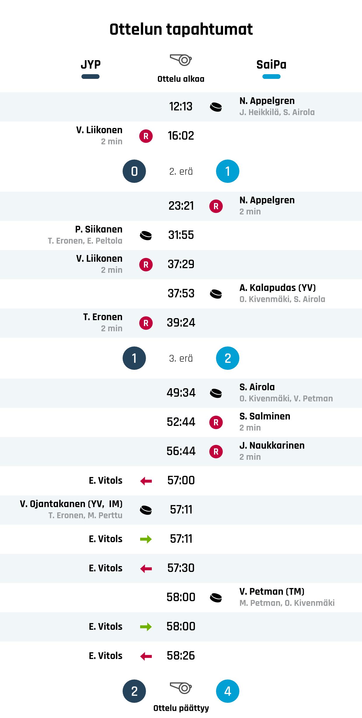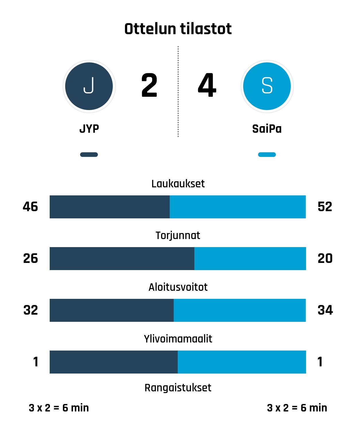 SaiPa voitti JYP:n jääkiekon SM-liigassa lukemin 2-4. Ottelun torjunnat jakaantuivat JYP 26 ja SaiPa 20.